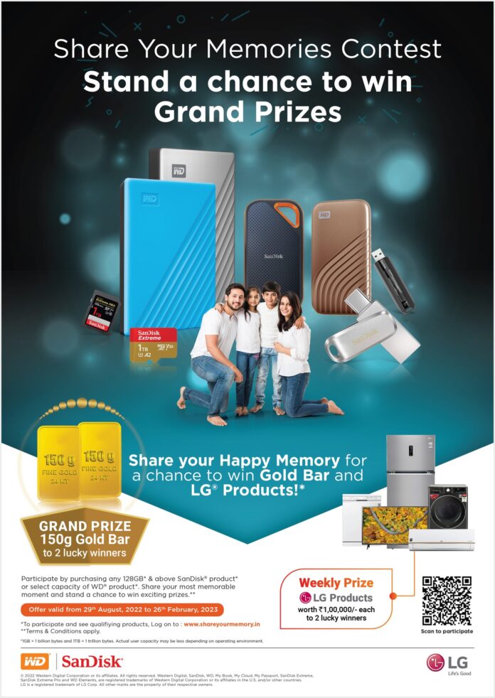 Western Digital kicks off its new six-month festive competition called “Share Your Memories”. Consumers buying select Western Digital offerings including SanDisk products, 128 GB* and above, or any WD products, 2TB* and above, will be eligible to participate in this exciting contest. Two winners will be selected every week, who will win vouchers worth Rs. 1,00,000 each that can be redeemed to buy LG Electronics consumer durable products from a physical marketplace.