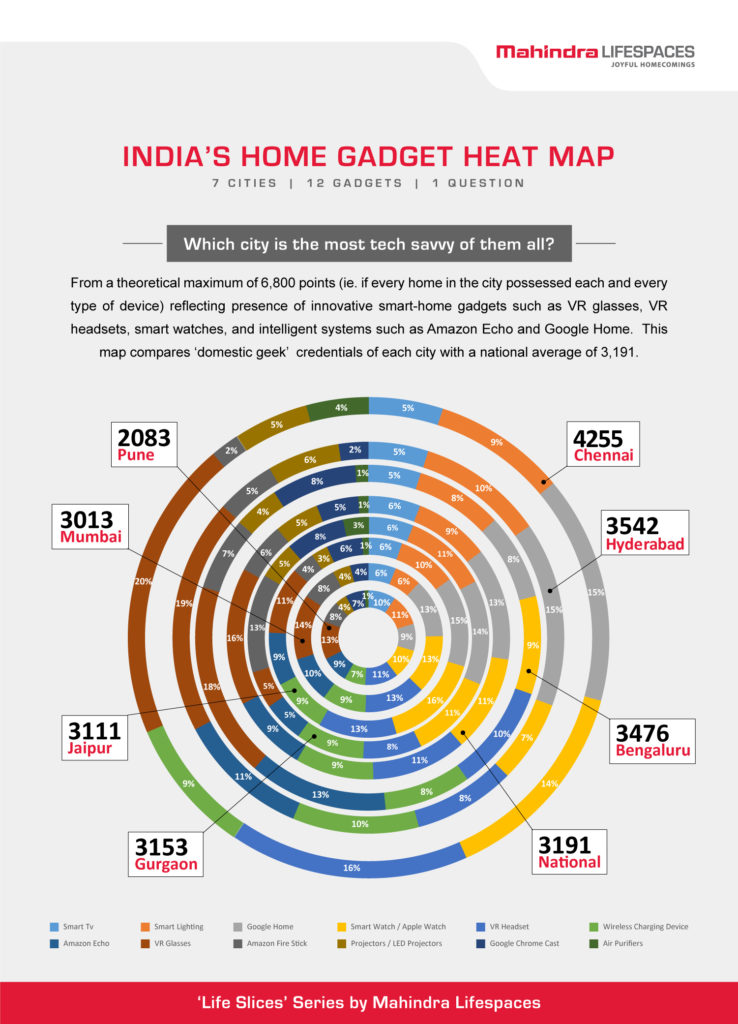 - Chennai householders owned the highest volume of smart-home gadgets i.e. Seven. The poplar devices at homeowners included Smart TV, Smart Lighting, Smartwatches, VR Headset + Glasses and Wireless charging devices
