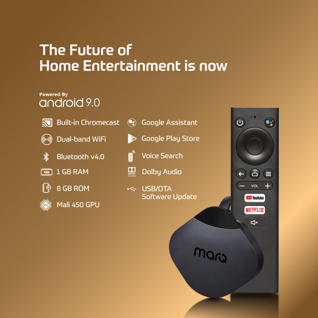 ‘MarQ TurboStream’ is equipped with industry-leading features. The device is designed specifically for value shoppers who are looking to buy more affordable non-smart TVs and turn them into smart TVs. It comes with Full HD resolution of 1920*1080 at 60 frames per second; 1 GB DDR3 RAM; 8GB ROM; and streaming support for 2.4 GHz and 5 GHz WiFi. It sports Dolby Digital Audio and a voice-controlled remote with Google Assistant. Moreover, unlike other products in the market, MarQ TurboStream leverages the power of the latest Android 9.0 and offers several advantages to consumers. With built-in Chromecast, it allows users to cast their mobile phone screens onto the TV and supports all apps available on the Google Play Store.
