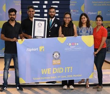 An official Guinness World Record adjudicator was on hand to observe and certify the new record. The previous record stood at 18 mattresses tall stack measuring up to 5.2m(17ft), Flipkart smashed it by stacking 45 mattresses and achieving a height of 6.9m(22.9ft