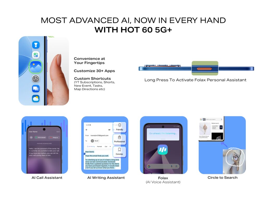 The HOT 60 5G+ introduces an industry-first customizable One Tap AI Button, integrated seamlessly into the phone’s design to offer smooth control over daily tasks. Offering dual functionality through double press and long press, this feature can be customized for over 30+ apps and actions, making everyday tasks faster and more efficient. Whether it’s quicker typing, smoother gaming, or instant access to essential tools, it puts everything right at your fingertips. A long press instantly activates Folax, Infinix’s built-in AI assistant, which enhances on-screen awareness by adapting to your usage by keeping important info in view, minimizing distractions, and offering smart, contextual prompts to boost focus. Adding to its AI-first experience, the HOT 60 5G+ also introduces Circle to Search—another first in the segment—offering a faster, more seamless way to find what you need without leaving your screen. Fully customizable and deeply integrated with XOS 15, the One Tap AI Button creates a personalized, responsive experience that seamlessly bridges productivity, entertainment, and daily convenience.