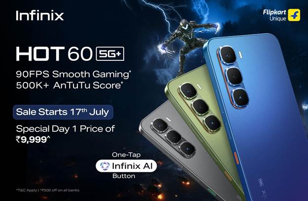 Infinix, a new-age smartphone brand, announces the launch of its latest offering, HOT 60 5G+, a feature-loaded smartphone engineered for those who demand versatility, speed, and long-term performance. The HOT 60 5G+ arrives with industry-defining features such as a customizable One Tap AI Button, MediaTek Dimensity 7020 processor scoring an AnTuTu Score of 500K+, 6GB LPDDR5X RAM, 90FPS gaming support, and an IP64-certified slim 5G design, all at a special launch day price of INR 9,999 (inclusive of prepaid offers). The device will be available on Flipkart and retail stores in three colorways: Shadow Blue, Tundra Green and Sleek Black, offering a premium visual identity to match its performance DNA.