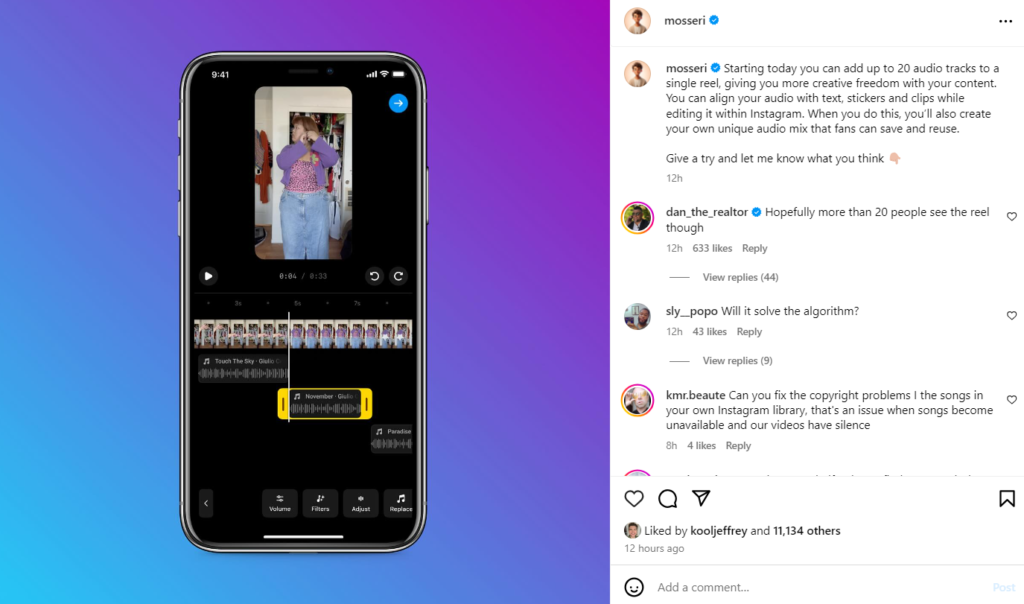 On this development, Instagram’s Head, Adam Mosseri, last night stated, “Starting today you can add up to 20 audio tracks to a single reel, giving you more creative freedom with your content. You can align your audio with text, stickers and clips while editing it within Instagram. When you do this, you’ll also create your own unique audio mix that fans can save and reuse. Give a try and let me know what you think ”