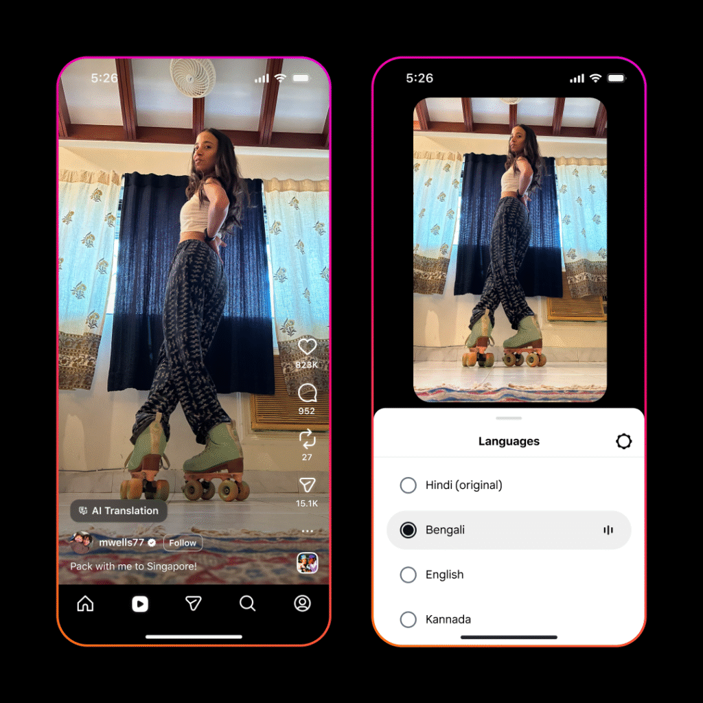 We’re excited to announce in the coming months you will soon be able to use Meta AI to translate reels in five new Indian languages, helping you discover more entertaining content from across India and around the world. In October, we launched the ability for creators to dub and lip-sync their reels to and from English, Hindi, Spanish, and Portuguese, helping them reach more people globally. Now, the same capability will soon be available in Bengali, Tamil, Telugu, Kannada, and Marathi