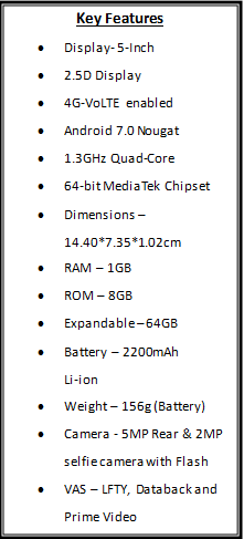 Running on Android 7.0 OS, the 4G dual-SIM smartphone is powered with a light 2200mAh Li-Ion battery, with a talk-time of upto 5 to 6 hours and a standby time of 8-10 days.