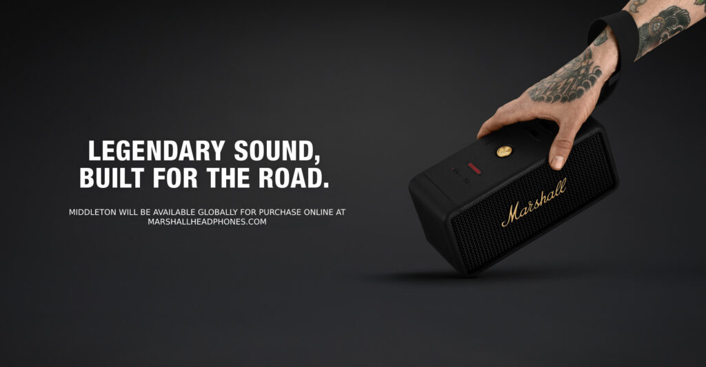 Middleton holds true to the iconic design that speaks to the brand’s heritage while delivering on a more sustainable approach from Marshall. The speaker’s sturdy build comprises 55% post-consumer recycled plastic from used electronics, water bottles and automotive light covers, and is 100% PVC-free.