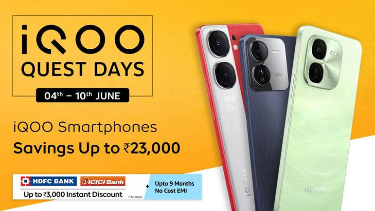 iQOO, the high-performance smartphone brand, has announced exciting offers and discounts on a range of iQOO smartphones during the iQOO Quest Days, which will last until 10th June, 2024. The discounts apply to various models, including the iQOO 12, iQOO Z9x, iQOO Z9, iQOO Neo9 Pro, iQOO Z7 Pro, iQOO Neo 7 Pro, and iQOO 11, available on the iQOO e-store and Amazon.in. Additionally, customers can get an instant bank discount of up to INR 3,000 with HDFC Bank and ICICI Bank cards, along with a no-cost EMI option for up to 9 months.