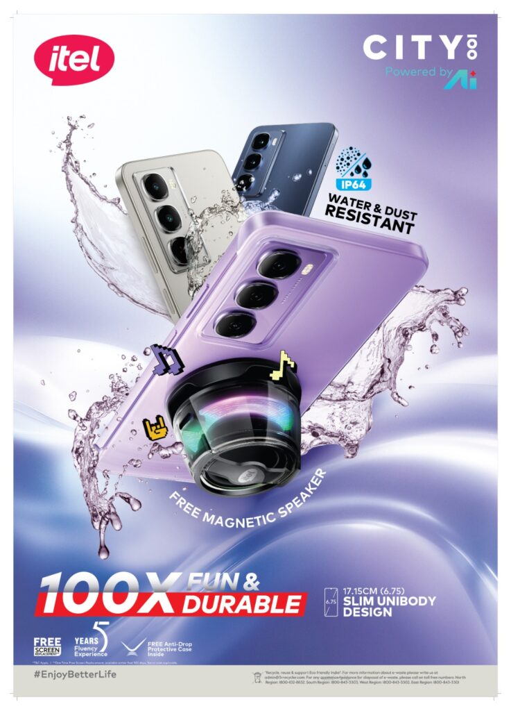 itel today announced the City 100 – a new smartphone that folds large screen immersion, long haul battery life and practical on device AI into a sleek 7.65 mm unibody design in the budget segment. The City 100 smartphone is engineered with IP64 rated protection, making it resistant to rain, the occasional spillages and is completely dust proof – guaranteeing durability and strength that are unrivalled in the segment. It boasts a large battery of 5200 mAh – ensuring users are all set for the entire day. Featuring a large storage capacity of 128 GB ROM, it is priced attractively at just Rs. 7599 and is available in attractive colours of Fairy Purple, Navy Blue and Pure Titanium in retail stores across India. itel is also offering a free magnetic speaker worth Rs. 2999 with the City 100 smartphone – making it a very lucrative offer. It also offers a free screen replacement within 100 days – ensuring unmatched reliability only provided by itel in India.