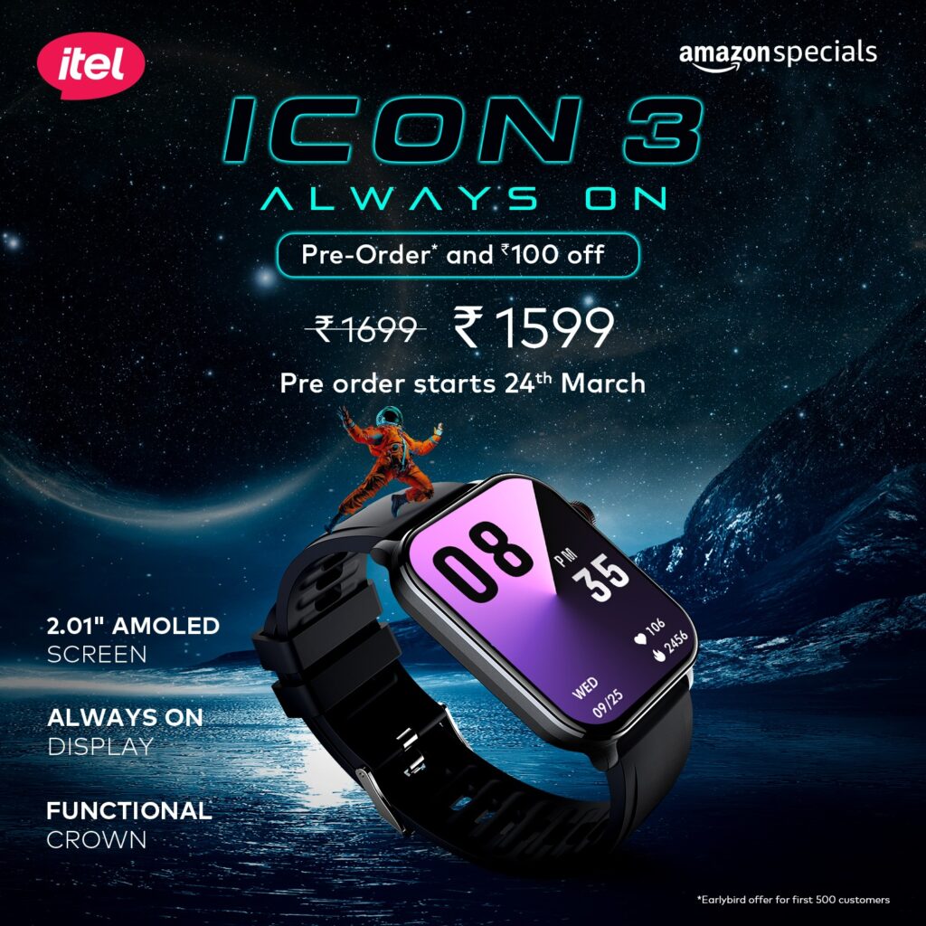 itel, a leading technology brand in India, elevates its smartwatch lineup with the launch of the itel ICON 3, boasting a stunning 2.01-inch AMOLED display with an impressive 500 Nits brightness. The itel ICON 3 introduces a premium zinc alloy watch frame complemented by 2.5D curved glass, ensuring a sleek and stylish design. With single chip Bluetooth calling functionality and dual side keys with a functional crown this smartwatch offers seamless connectivity and easy navigation. Packed with features like an always-on display, 150+ stylish watch faces, and 24-hour health monitoring, the ICON 3 is available at an attractive price of INR 1,699. The smartwatch will be up for pre-booking from 24th March until 29th March, 12 noon exclusively at Amazon. The brand has announced a special pre-order discount of Rs.100 for the first 500 customers. It will be also available across all retail outlets starting 24th March.