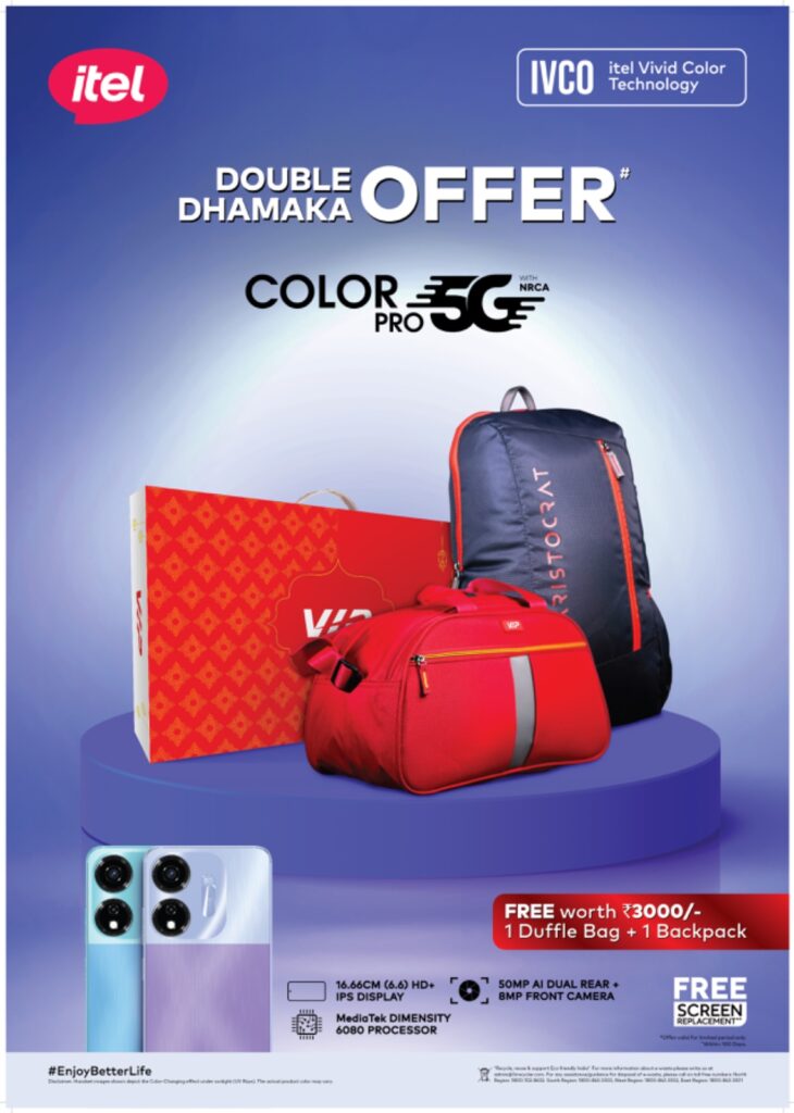 As the festive season begins, itel is set to elevate the celebration with its Double Dhamaka offer on the recently launched Color Pro 5G. Designed to enhance the consumer experience, itel is offering not one, but two exclusive gifts—a stylish duffle bag and a trendy backpack—with every purchase of the Color Pro 5G. To further ensure customer satisfaction, itel is including a complimentary screen replacement worth Rs.2000 within 100 days of purchase. Featuring 5G++ NRCA technology, the Color Pro 5G is poised to be the must-have device of the season, offering a compelling combination of cutting-edge performance and exceptional value. This cutting-edge device also features the revolutionary Next-Gen IVCO (itel Vivid Color) Technology, which changes the smartphone’s back panel colour in sunlight to further enhance its aesthetic appeal. These offers combine to bring the effective price to an incredibly competitive level in the 5G segment, a value proposition unmatched by any other brand.