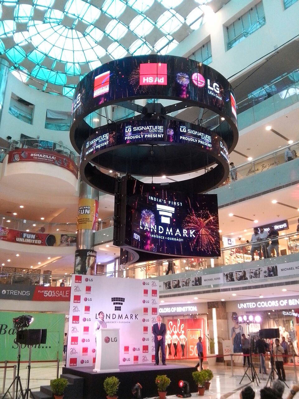 The Landmark Signage has been introduced at Ambience Mall, Gurgaon. Along with presenting top-notch 4K content, the Signage is also capable of creating immersive Augmented Reality experiences. This is the first time that the norms of conventional design and aesthetics have been challenged and stepped-up to create a display technology never seen before. The mammoth Landmark Signage weighs 4.8 ton and has been suspended by punching 6 rigging points into the huge pillars of the Ambience Mall building structure. The LG OLED panels used offer exclusive flexibility in design and therefore can be customized into different shapes and sizes. This unconventional display content technology has opened new doors for the industry as well as for marketers. The LG Landmark Signage as a unique form of display technology, can be leveraged by brands to reach their consumers like never-before.