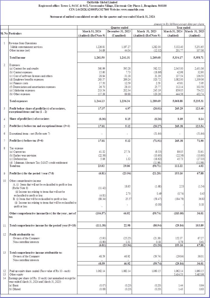 OnMobile Global Limited (“OnMobile”), the global leader in mobile gaming & entertainment, today announced the financial results for the Fourth quarter of FY24 ended March 31, 2024.
