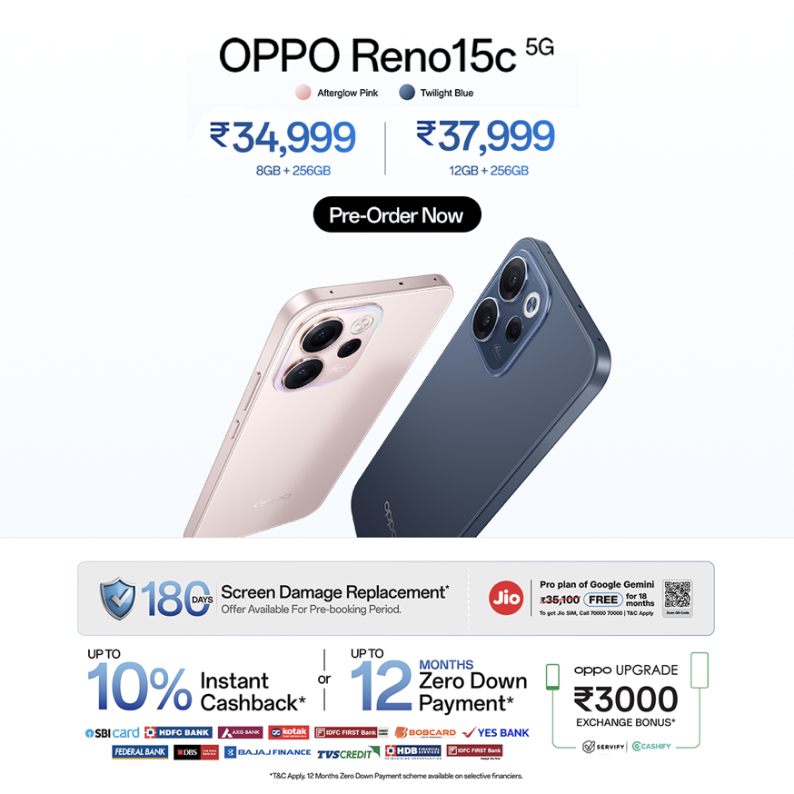 The Reno15c is available at INR 34,999 for the 8GB + 256GB and INR 37,999 for the 12GB + 256GB variant. The OPPO Reno15 Series is available for purchase with exciting offers on Amazon, Flipkart, Mainline Retail Outlets and OPPO E-store.