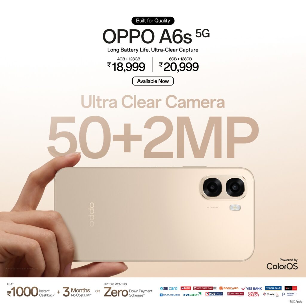 Priced at INR 18,999 for 4GB+128GB, and INR 20,999 for 6GB+128GB, the OPPO A6s 5G will be available from today onwards across Amazon, Flipkart, OPPO Store, and mainline retail outlets, in two colour options – Aurora Gold and Plum Purple. Customers can avail an instant cashback of Flat INR 1,000 and enjoy 3 months of No Cost EMI on select credit cards from leading partners including SBI Cards, Kotak Mahindra Bank, IDFC First Bank, BOB Cards, YES Bank, Federal Bank, DBS and many more. Additionally, Zero Down Payment schemes for up to 8 months are available through select financial partners, making it easier than ever to own the OPPO A6s 5G.