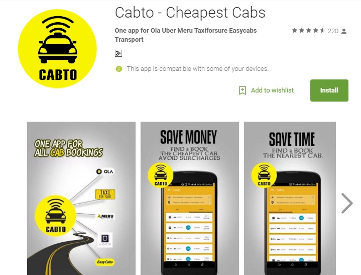 Cabto is extremely easy to use, all you need to do is download the app from Play store and upon opening the app it shows all available cabs/Autos in your vicinity with surcharge information, Per km price, Vehicle type etc. If you provide destination it calculates prices & filters with cheapest cab/auto on top. You can directly book Ola, Easycabs from Cabto. Uber & Meru reroute to their apps. Cabto also shows nearby places to explore which could be a useful feature on travel.