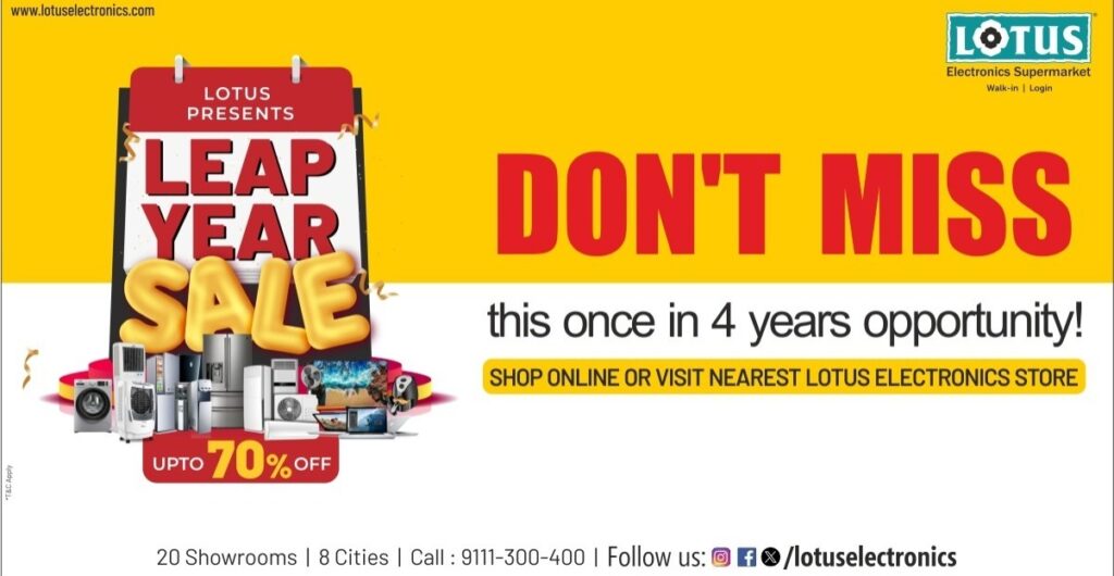 Lotus Electronics, a leading electronics retailer in India, is excited to announce its once-in-a-four-years Leap Year Sale. The sale offers customers a rare chance to grab the latest and best gadgets and home appliances at jaw-dropping prices. From February 25 to February 29, 2024, customers can save up to 70% on various products across the store, along with free gifts and cashback offers on select items, making it the most irresistible deal of the year.