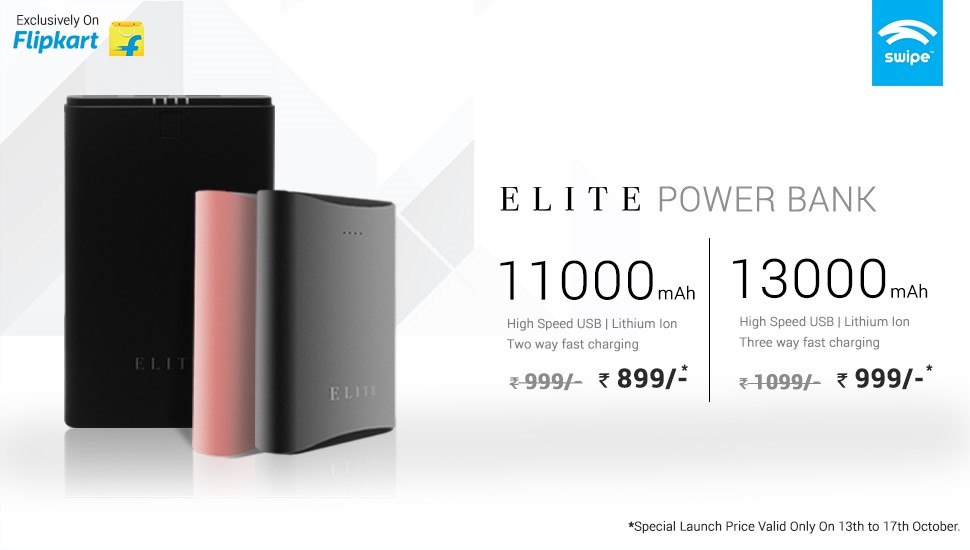 Swipe ELITE 13,000 mAh and 11,000 mAh power bank are available at a special launch price of Rs. 999/- and Rs. 899/- only on 13th to 17th October. Both the models are exclusively available on Flipkart from 13th October, 2017.