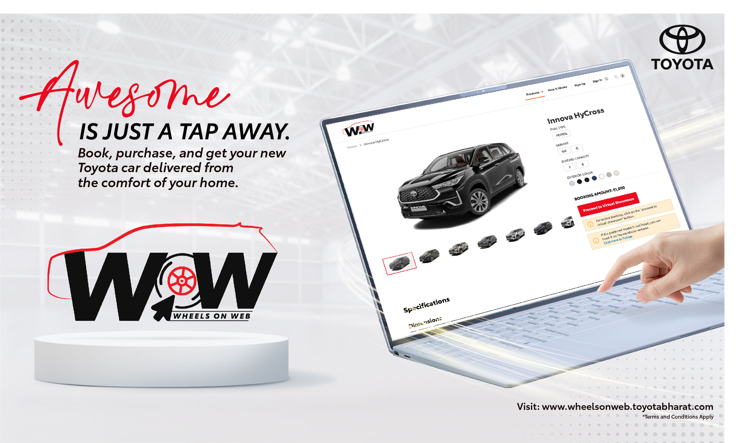 “In line with our core philosophy of ‘Customer First’, we are continuously striving to deliver ever-better services to the consumers. We believe that our newly launched ‘WOW’ (Wheels on Web), online retail platform, will revolutionize the car buying experience in India, said, Vice President, Sales and Strategic Marketing – Mr. Atul Sood from Toyota Kirloskar Motor.