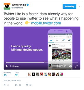 Twitter Lite is now globally available via mobile.twitter.com and makes Twitter more accessible to millions of people – all one needs is a smartphone or tablet with a browser, no App Store or Google Play account required. It supports 42 languages including six Indic languages: Hindi, Bengali, Kannada, Tamil, Gujarati, and Marathi. For more info about Twitter Lite, you can visit lite.twitter.com.