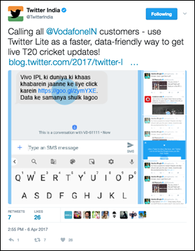 Arvinder Gujral, Senior Director, Business Development, Twitter Asia Pacific, said, “Cricket is one of the most talked about topics in India, and the volume and diversity of conversations with fans, players, commentators and teams is reflected on Twitter. For example, there were over 10.6 million Tweets about the Indian Premier League (IPL) during last year’s T20 season. Through the partnership with Vodafone, we are increasing the accessibility and visibility of Twitter Lite on one of the largest mobile networks in the world. We’re excited to have Vodafone, a brand that shares our passion for cricket, on board to help us reach millions of Indians and unite the nation in the spirit of cricket. This is an innovative example of how we can partner with companies all over the world to make Twitter Lite more useful in people’s daily lives.”