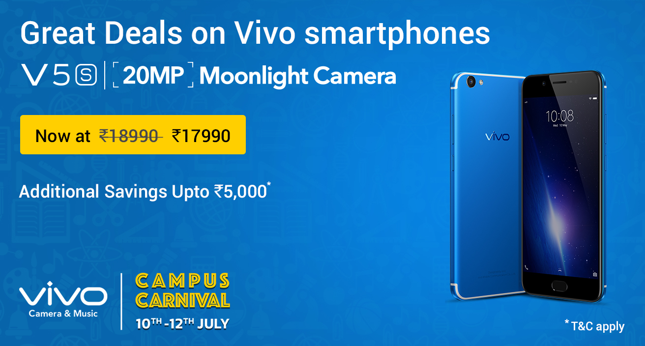 Vivo, the premium global smartphone brand announced its first ever ‘Vivo Campus Carnival ‘on Flipkart today. The three-day carnival which begins on July the 10th will witness a host of exciting offers across all Vivo smartphones with flat discount of Rs. 1000 on its best-selling Model Vivo V5s. During the carnival, Vivo V5s will be available at Rs. 17,990.