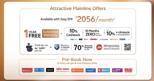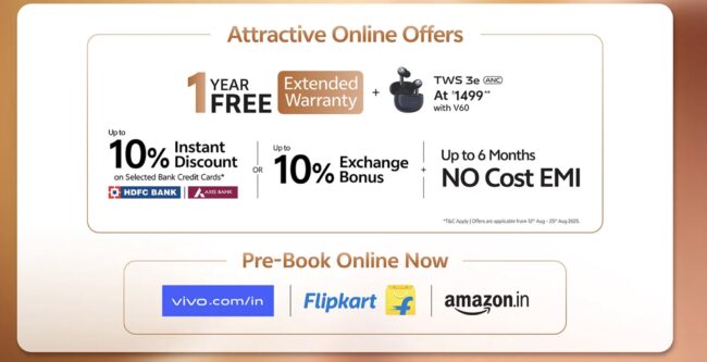Designed to deliver design precision, exceptional photography experience, and powerful performance, the vivo V60 will be priced at INR 36,999 (inclusive of taxes) for the 8GB + 128GB variant, INR 38,999 (inclusive of taxes) for the 8 GB + 256 GB variant, INR 40,999 (inclusive of taxes) for the 12GB + 256GB variant, and INR 45,999 (inclusive of taxes) for the 16GB + 512GB variant and will go on sale starting August 19 across vivo official website, Flipkart, Amazon, and all partner retail stores. Consumers can pre-book the V60 starting today at vivo exclusive stores and partner retail stores. To make the purchase more exciting, consumers can avail any of the below offers: