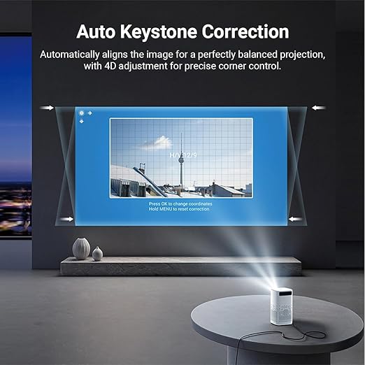 Display and Setup-  The projector can scale up to a 150-inch screen size, delivering an immersive veiewing experience across environments. It features Auto Keystone Correction, which digitally adjusts the image shape and remote focus, allowing users to sharpen the picture using the included remote control rather than manual lens adjustments.