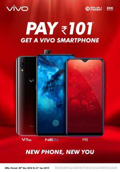 Vivo India, today announced an exclusive offline offer ‘New Phone, New You’ to celebrate the Christmas and New Year festivities. The 41 days offer period starts from December 20th 2018 – January 31st 2019 across all partner outlets pan India. With this offer**, customers can buy any Vivo smartphone above the value of INR 10,000* by making an immediate payment of INR 101 and paying the total amount in 6 equal EMIs.